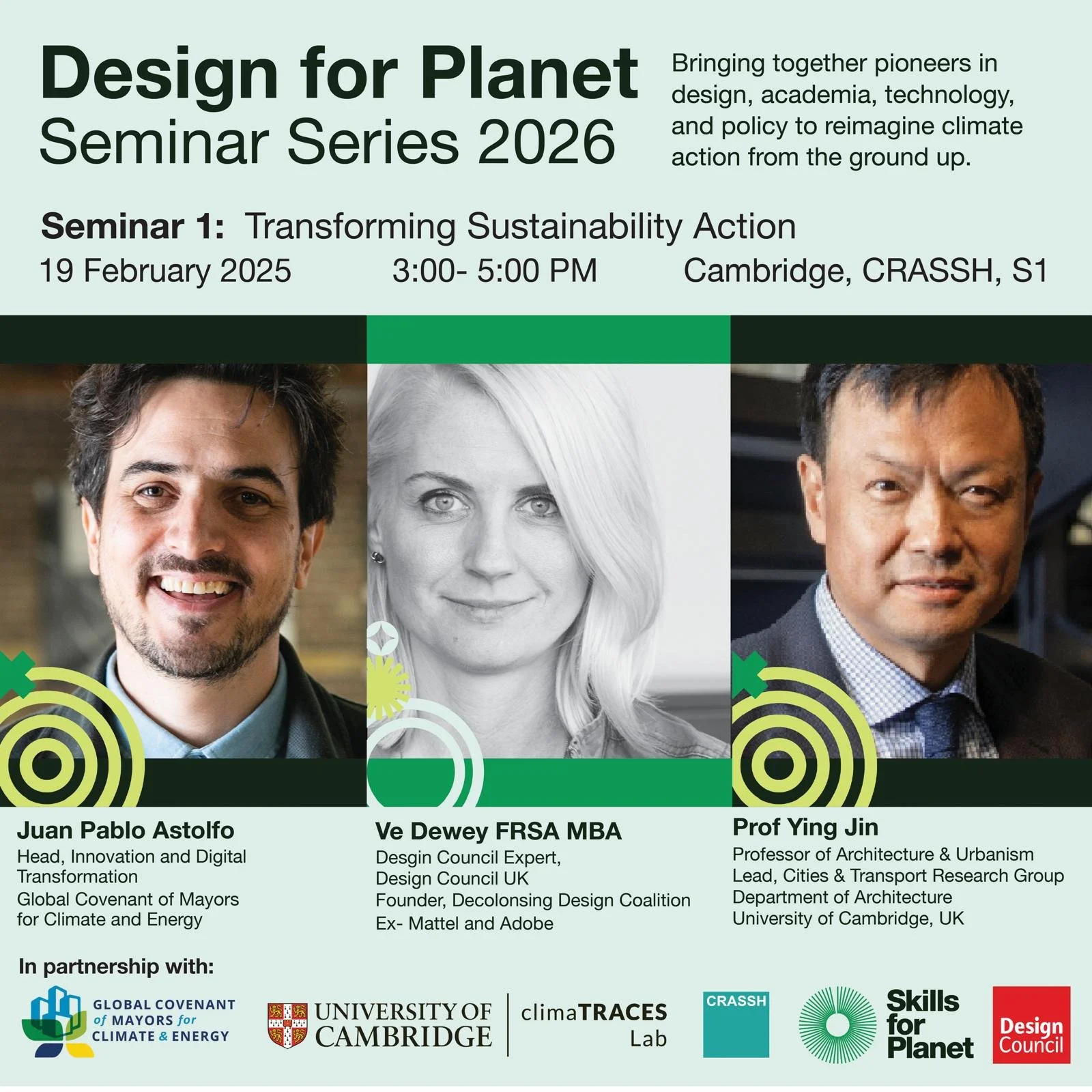 The Design for the Planet Seminar Series is run in partnership with the Global Covenant of Mayors for Climate & Energy (GCoM) and Design Council and organised by Ve Dewey (Design Council), Ramit Debnath (University of Cambridge), and Yen-Chin Wu (University of Cambridge).